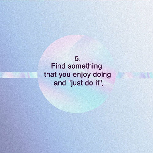 We all have something we love doing. Not sure what they are? Write down 10 things you enjoy doing. Don’t judge yourself or compare with others, write whatever they are. Prioritise the top 5 and make sure you do them weekly. Additional tip: Think of creative ways to make a living out of your top 5.